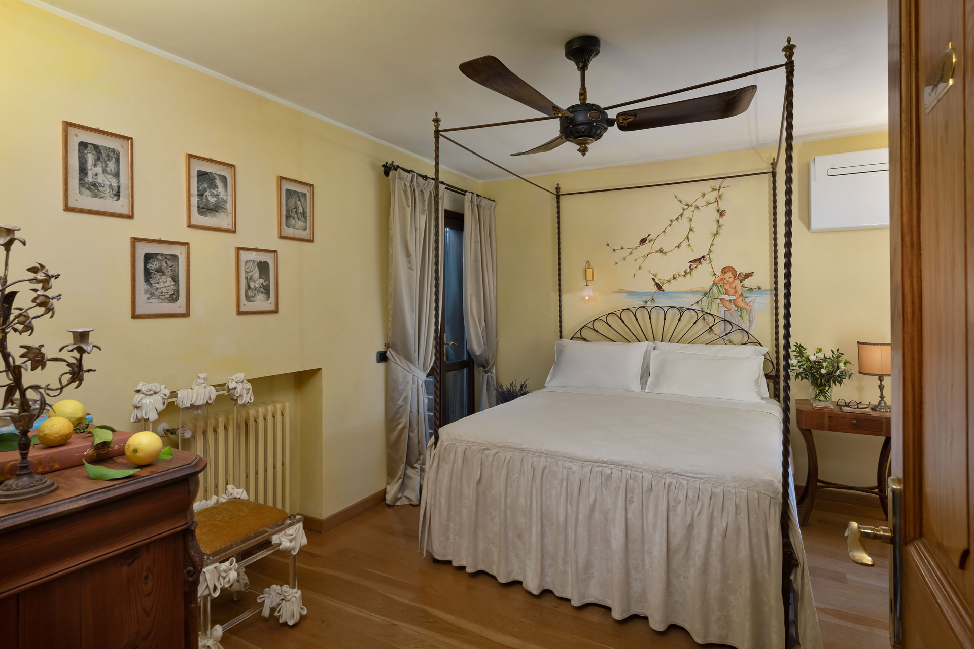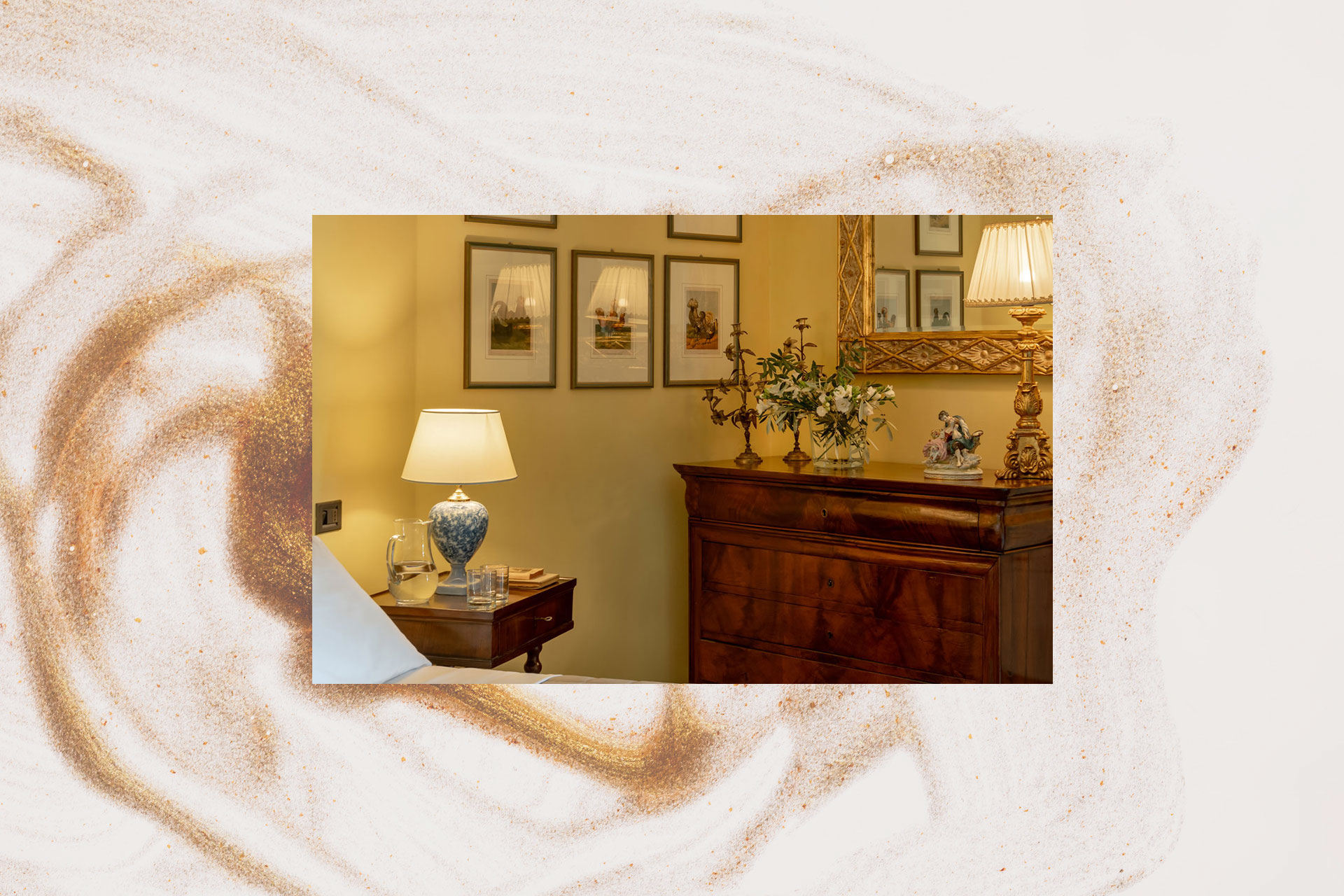 Das Wohnzimmer ist mit einem Schlafsofa ausgestattet, an einer Wand ein langes pharmazeutisches Regal. Als Erinnerung an seine antike Verwendung ein paar Gläser, die einst Gewürze enthielten und einige alte Bücher in verschiedenen Sprachen, nicht zu vergessen vier hölzerne Karnevalsmasken aus dem Comelico-Tal des Alto Cadore. An einem Kleiderständer hängt eine kleine Sammlung von Holz- und Bambuskäfigen. Ergänzt wird die Einrichtung durch einen venezianischen Kleiderschrank aus lackiertem Weichholz aus dem 18. Jahrhundert.